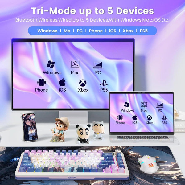 - 【Liberté sans fil triple mode】Basculez facilement entre les modes 2,4 GHz à latence ultra-faible (idéal pour les jeux compétitifs), Bluetooth 5.0 (appairage de 3 appareils) et USB-C filaire. Ce clavier mécanique sans fil offre une compatibilité multiplateforme optimale ; il fonctionne parfaitement avec Windows, Mac, PS5, Xbox et appareils iOS/Android. Contrôlez jusqu'à 5 appareils simultanément grâce aux touches de mode dédiées.