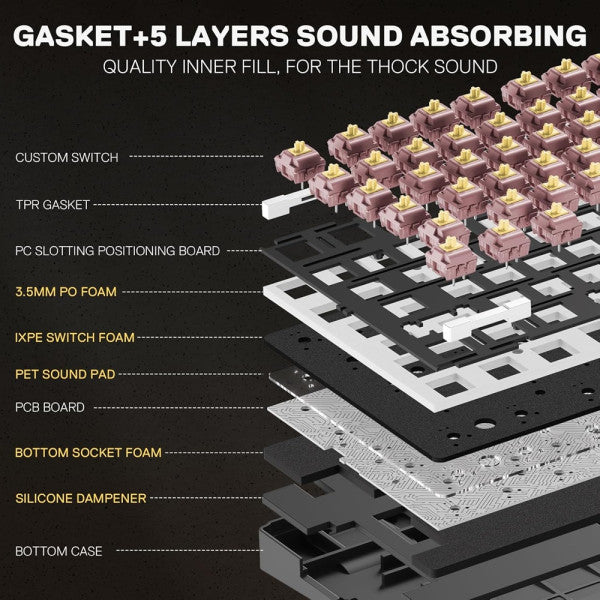 - Réduction du bruit x5 - Équipé de mousse PO de 3,5 mm, de mousse pour les touches IXPE, d'un coussinet acoustique PET, d'une mousse pour la partie inférieure, d'un coussinet inférieur en silicone et d'un joint en silicone, ce qui réduit considérablement les bruits creux, créant une acoustique de frappe atténuée et ultra-propre, pour une frappe agréable et confortable.