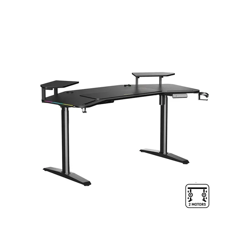 Bureau gamer noir avec hauteur réglable, éclairage RGB et accessoires intégrés pour un espace de travail ergonomique et moderne.